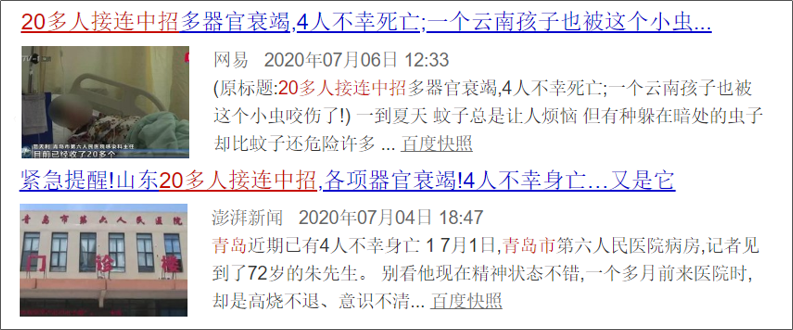 如有你有關(guān)注新聞,你應(yīng)該知道,最近因?yàn)檫@個(gè)小蟲子中招的人的不少,他們大多是在去野外游玩的時(shí)候中招,青島電視臺(tái)、各資訊網(wǎng)站還報(bào)道了4人因此而死亡。